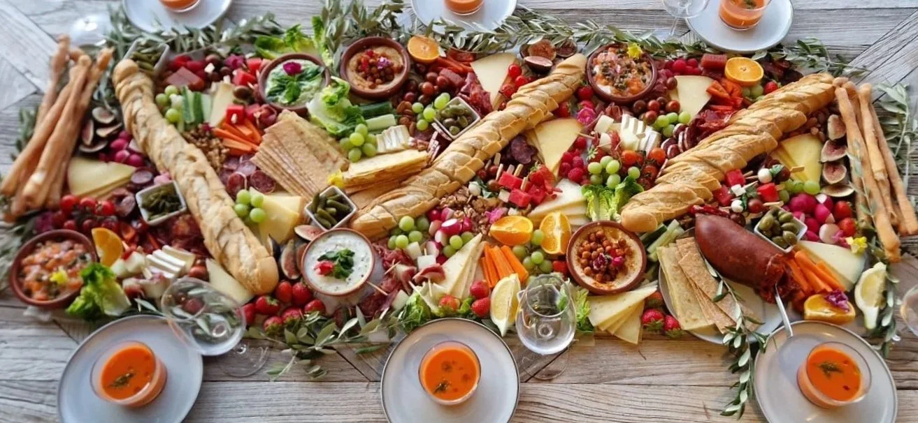 An abundant grazing table that stretches from one end of the table to the other. A lavish spread of local cheeses, meats, gazpacho, tapas, dips, vegetables, fruits, fresh breads. Adequate as a light meal.